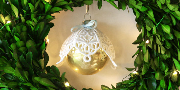 Stunning freestanding lace and sheer organza come together to create a beautiful ornament cover for your Christmas tree! Project instructions demonstrate how to stitch and assemble the stunning design.