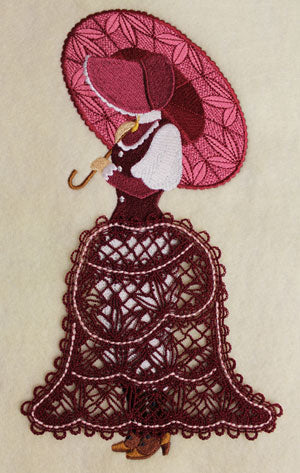 Umbrella Girl and Battenburg lace -- a marriage made in heaven! We've taken Umbrella Girl, a beloved embroidery icon for many decades, and dressed her up in a little lace.