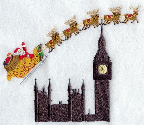 Santa's Flight Over a Snowy Village Scene (Whitework)