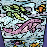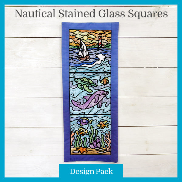 Inspired by stained glass, these machine embroidery designs features a colorful ocean scene.