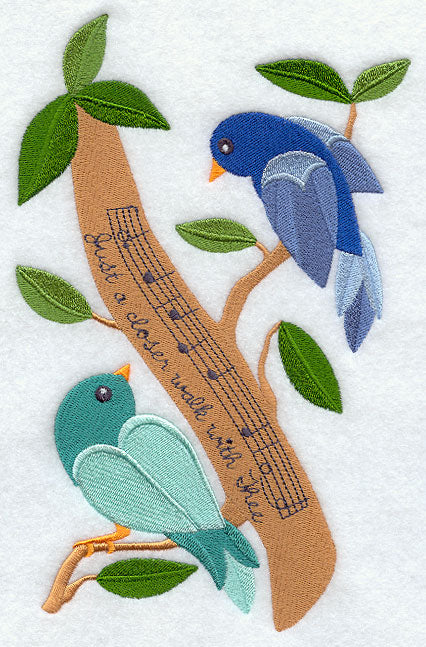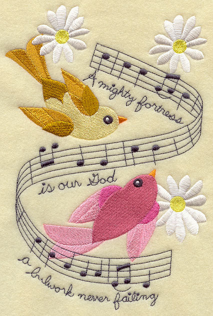 Little birds tweet the words and melody of beloved hymns. Colorful and spirited embroidery!