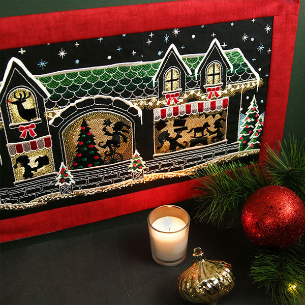 • This is a set of four panels that combine to create a completed Santa's Workshop scene.