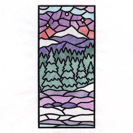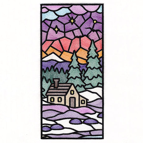 Inspired by stained glass, this set of four machine embroidery designs were create to combine and create a dreamy winter landscape at sunrise.