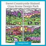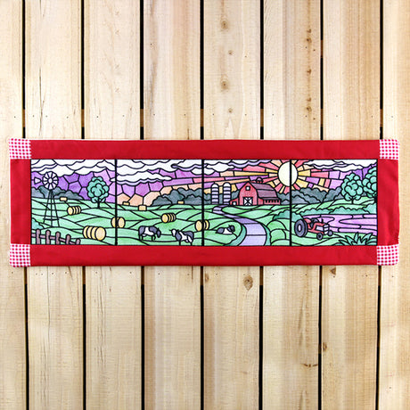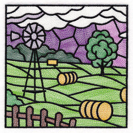 Inspired by stained glass, this set of machine embroidery designs features an idyllic countryside farm at sunset.