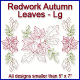 Design pack contains five vintage redwork autumn leaves designs, all smaller than 5 x 7 inches.