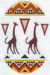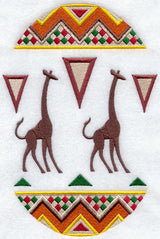 Traditional African basket patterns, along with a silhouettes of giraffes, form this design.
