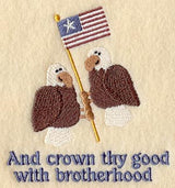 Two eagles hold a patriotic flag. Inspired by the national hymn of the United States, America the Beautiful.