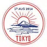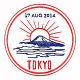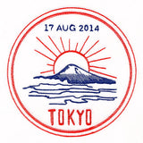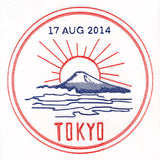 Made to look like a passport travel stamp, this machine embroidery design features a sun, mountains, and the location of Tokyo, Japan!
