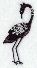 A graceful crane is decorated with metallic silver Bidri (Indian) art.