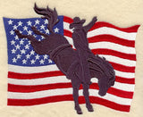A bucking bronco and rider silhouette in front of a U.S. flag