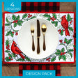 This festive design pack includes four coordinating corner designs, each featuring holly, berries and a sweet cardinal. Designed to work together as a full placemat layout, these beautiful motifs are perfect for holiday dining.