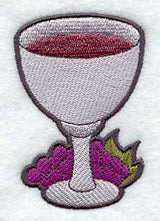 A ceremonial chalice, accented with grapes, contains sacramental wine for Communion. Embroider this sacred design onto church linens and communion banners.