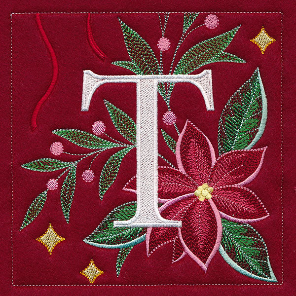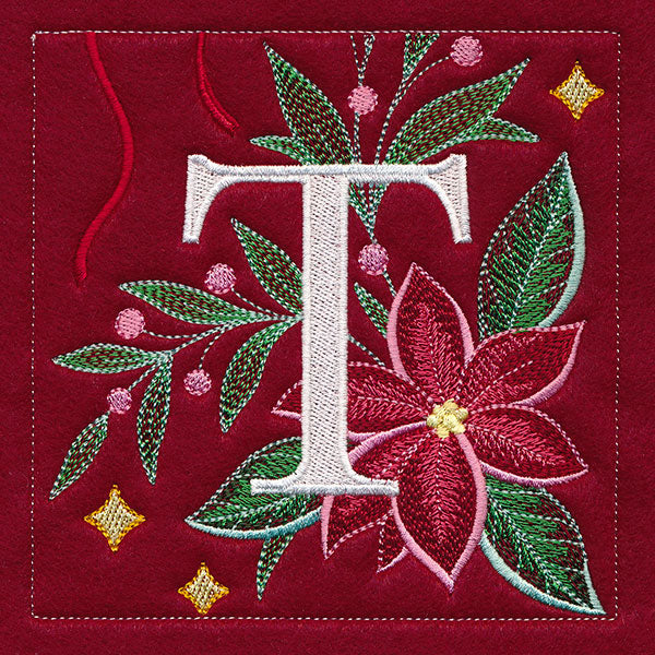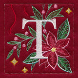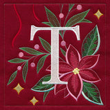 The letter "T" is surrounded by a poinsettia and botanicals in this stunning Christmas square.
