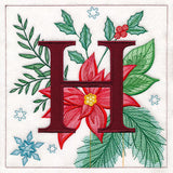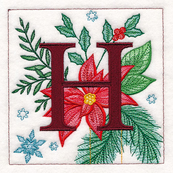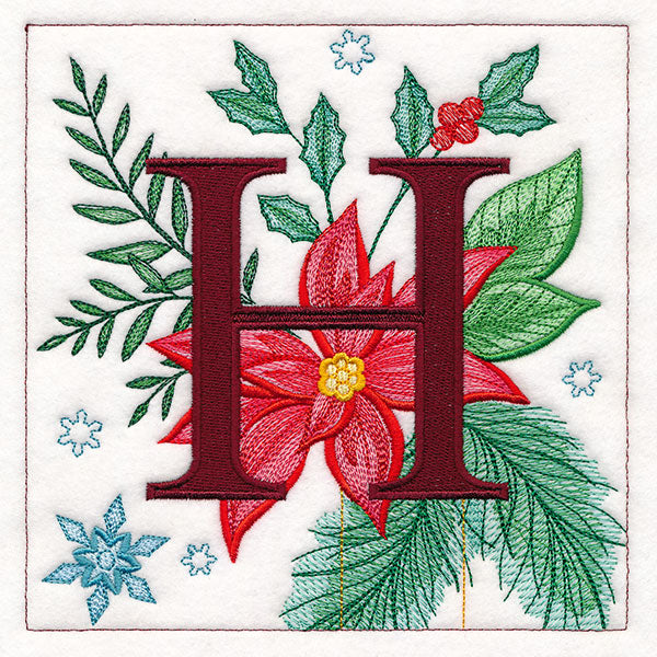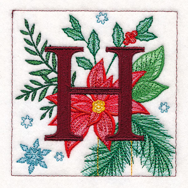 The letter "H" is surrounded by a poinsettia and botanicals in this stunning Christmas square.