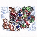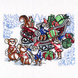 Gnomes load the sleigh with gifts, while sweet little mice prepare to lead it in this charming Christmas scene.