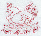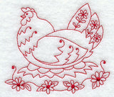 Delicate flowers decorate a redwork hen. Perfect for flour sack towels, tea towels, quilts, and more!
