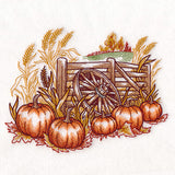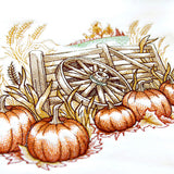 A wagon wheel sits framed by a pumpkin patch in an idyllic scene that's perfect for shirts, totes, pillows, and more.