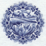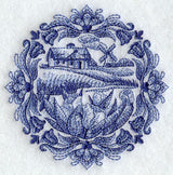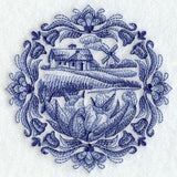 Stitched in shades of blue to represent the classic Delft Blue style, a country cottage scene decorates a beautiful medallion design.