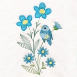 Bring a stitch of joy to your projects and home with a delicate bouquet of flowers featuring a bluebird.