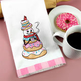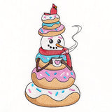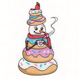 It's a snowman made of donuts! He's even holding a coffee cup and letting a cardinal sit on his head.