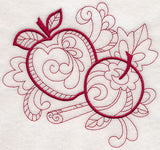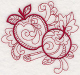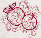 Satin stitch apples in the foreground, light running stitch detail in the background. This quick-stitching design is excellent on smooth, neutral fabrics, such as quilter's cotton and tea towels.