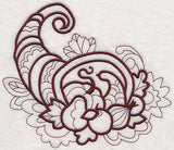 A satin stitch cornucopia in the foreground, light running stitch detail in the background. This quick-stitching design is excellent on smooth, neutral fabrics, such as quilter's cotton and tea towels.