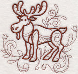 A satin stitch moose in the foreground, light running stitch detail in the background. This quick-stitching design is excellent on smooth, neutral fabrics, such as quilter's cotton and tea towels.