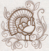 A satin stitch turkey in the foreground, light running stitch detail in the background. This quick-stitching design is excellent on smooth, neutral fabrics, such as quilter's cotton and tea towels.