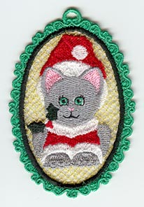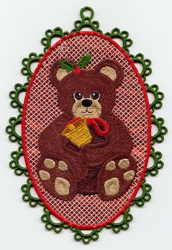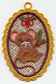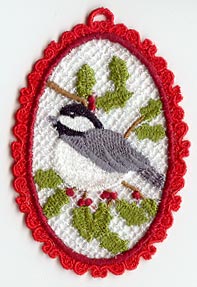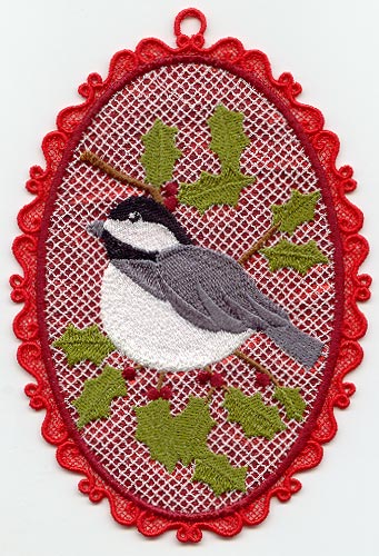 An amazing combination! Freestanding lace, with a fabric backing peeking through the cross hatching, makes a dramatic combination. It's a fantastic ornament for a Christmas tree, and they're light enough...
