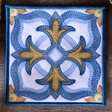 Add sophisticated charm to your space with the Flourishing Color Theory Square Coaster. Stitched in the hoop with shades of blue and gold, this symmetrical design features curved, architectural shapes and layered threadwork that brings dimension to every stitch with just four unique colors.