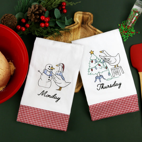 - Combine with the other days-of-the-week Christmas geese for a complete set of tea towels, or leave off the text to make aprons, table linens, and more.