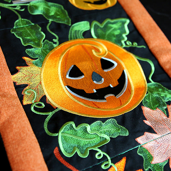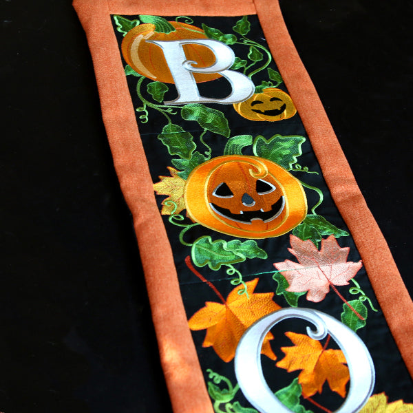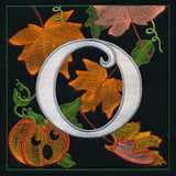 The letter "O" is surrounded by leaves and a frightened jack o' lantern in this machine embroidery design.