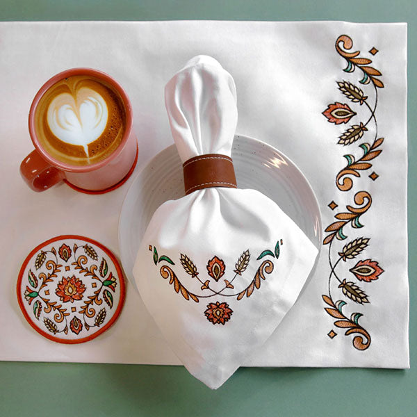 Bring the autumn magic to kitchen decor with an in-the-hoop coaster featuring folk-style fall botanicals.