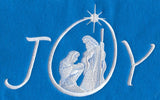 The word 'Joy,' with silhouettes of Mary, Joseph, and the baby Jesus. Great for shirt fronts, pillows, and wall hangings!