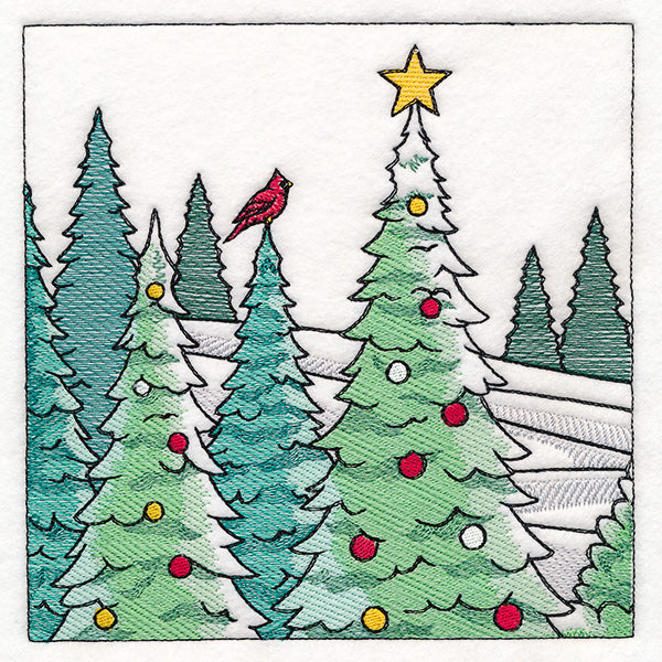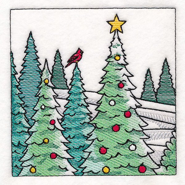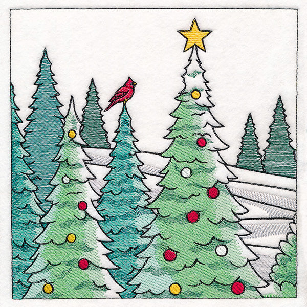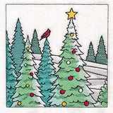 Take a trip to an idyllic Christmas landscape with this machine embroidery design. It features decorated Christmas trees and a cardinal perched on top.