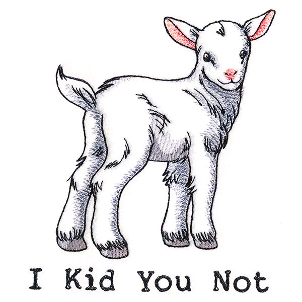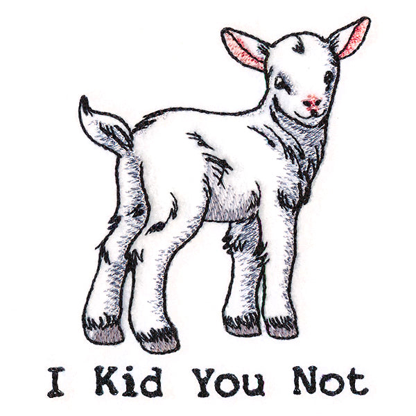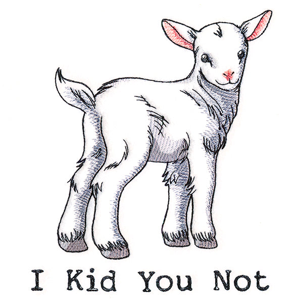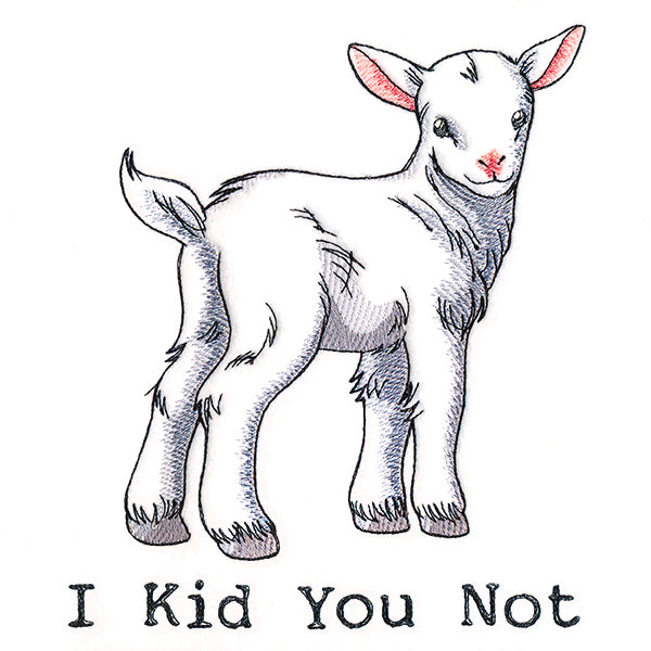 This sweet goat offers a clever way to say "I kid you not!" Bring humor to tea towels, pillows, totes, and more. This machine embroidery design contains sheer stitching and open areas; embroider on light-colored fabrics for best results.