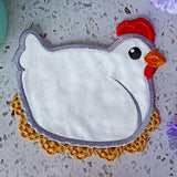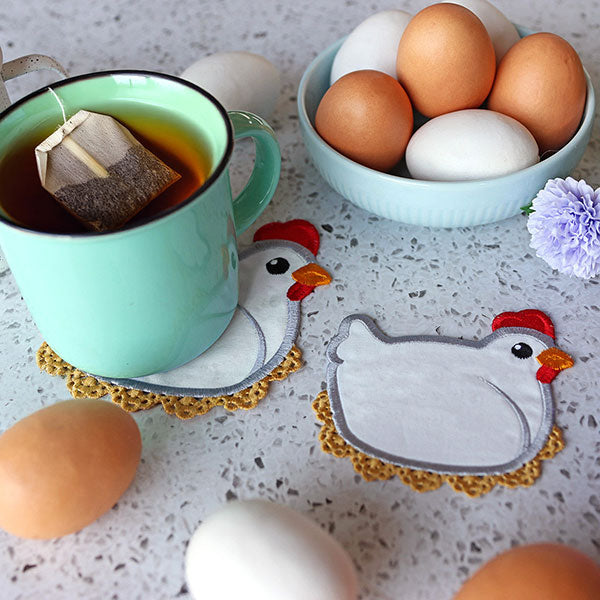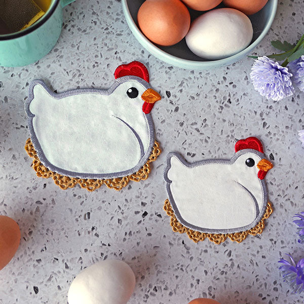 Add a touch of farmhouse fun to your table with this Lace Edge Chicken Coaster machine embroidery design. Stitched entirely in the hoop, this adorable hen-shaped coaster features a cheerful chicken silhouette framed with a delicate lace edge nest.