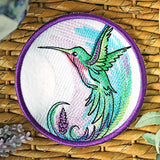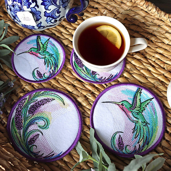 Add a splash of color and elegance to your kitchen with this Lavender Hummingbird Coaster. This in-the-hoop machine embroidery coaster features graceful lavender stems & a flouring hummingbird inspired by our original Lavender Hummingbird design design. Swirling lavender, and richly textured details, are perfect for spring and summer stitching. Get the whole set and stitch a coordinating trivet, potholder and coaster.— all designed for easy in-the-hoop construction with beautiful results.