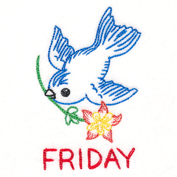 Drawn in a hand-stitched style, this days-of-the-week bird is a cheerful addition to your projects. Create a sweet tea towel for your Friday, or remove the text by skipping the last color stop and stitch this machine embroidery design onto curtains, table linens, dresses, and more.