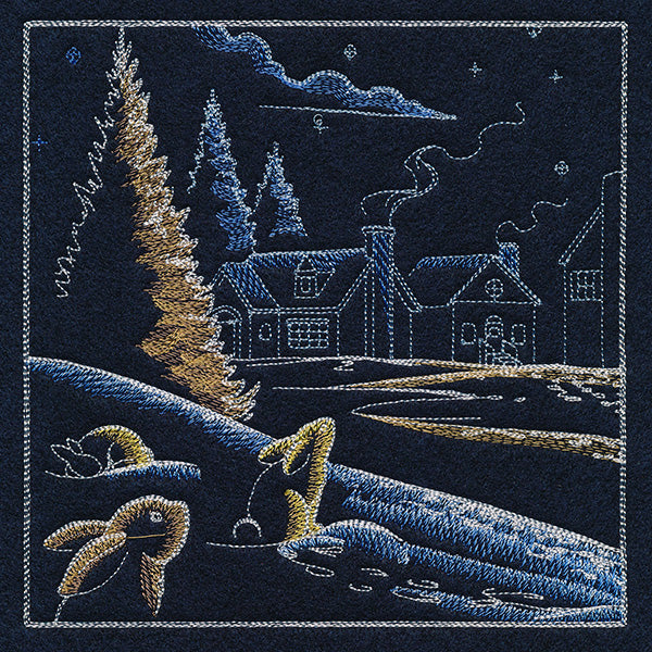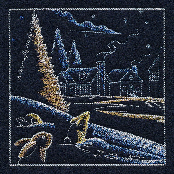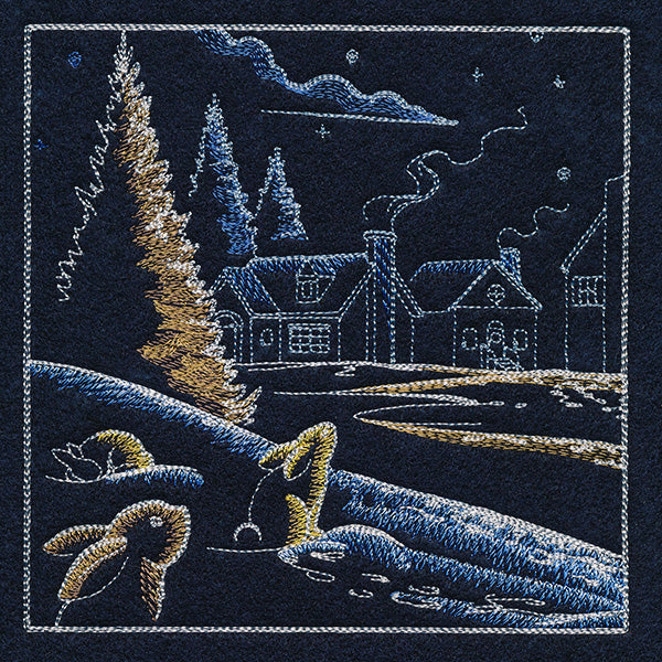 Take a trip to an idyllic landscape with this rendition of a quiet town. There are bunnies looking up toward the sky while resting in the snow. When stitched and assembled together with the other Magical Christmas Evening Scene designs, you end up with a stunning wall quilt featuring Santa's flight over a glowing Christmas village. There's even a snowman!