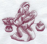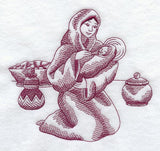 Mary cradles baby Jesus in her arms. Around her are the gifts of the Wise Men.