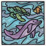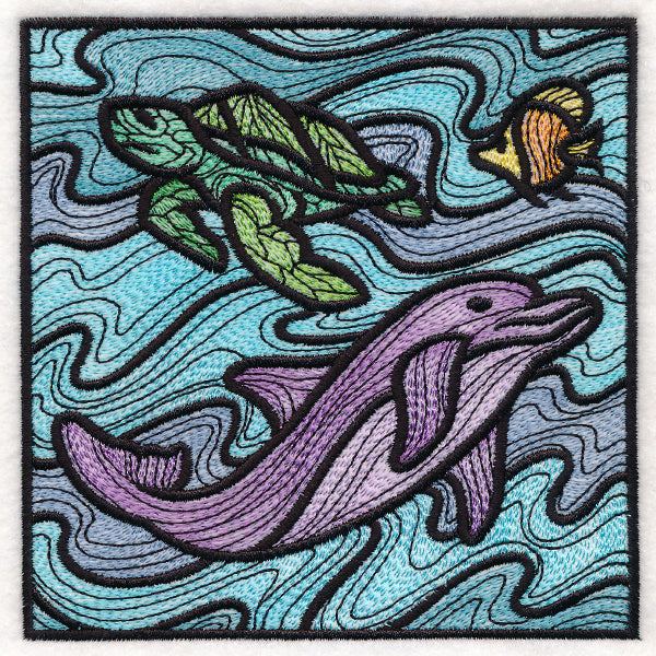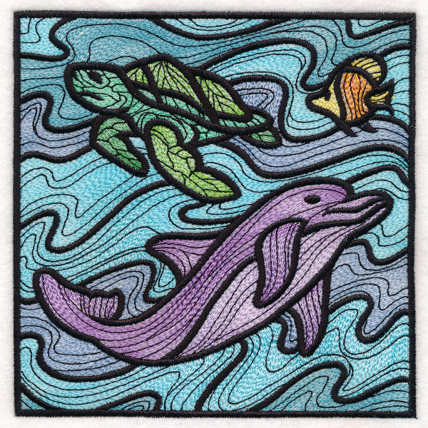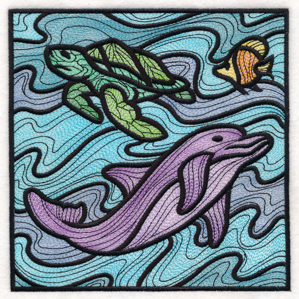 Inspired by stained glass, this machine embroidery design features a colorful dolphin surrounded by water and a sea turtle.