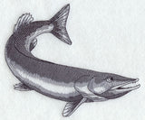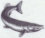 A quick-stitching fish sketch features a northern pike, swimming in a lake. Striking on lightweight towels, shirts, gear bags, and more.