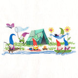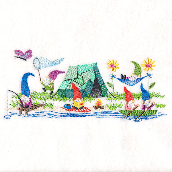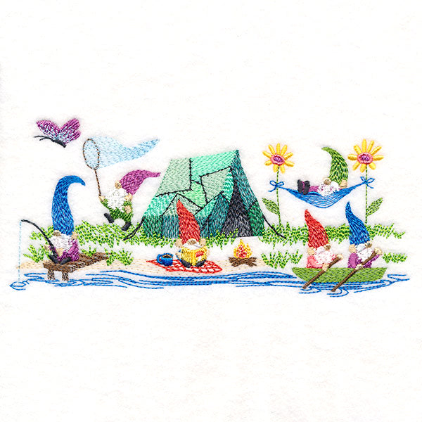 fishing gnome clothes, butterfly, butterfly net gnome hat, hammock gnome clothes, right boat gnome clothes, flower centers