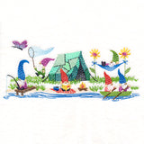 fishing pole, shoes, butterfly detail, tent stitching detail