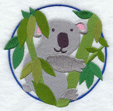 A baby koala peeks through eucalyptus leaves. Stitch a safari on totes, pillows, quilts, and more!