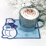 Cozy up with this happy in-the-hoop winter polar bear mug rug.