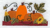 Pumpkins, squash, and a sunflower compose this autumn design. Great for kitchen towels!