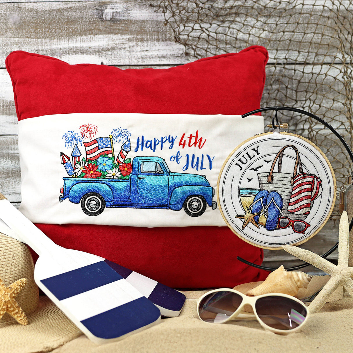 Flag and firework stripes and stars, flower petals, wheel rim detail