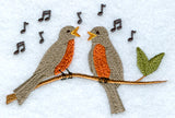 A pair of robins perch on a branch, singing. Music notes fill the air